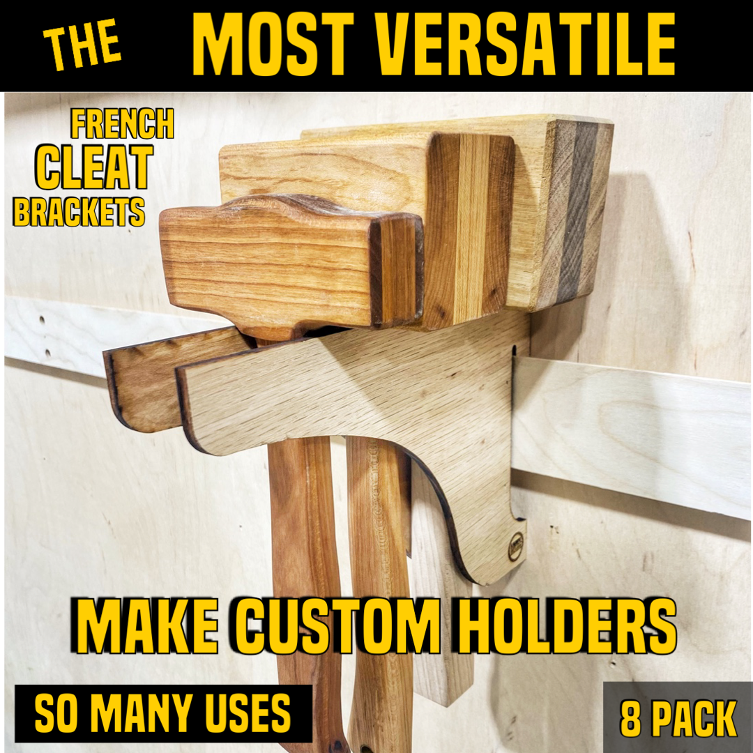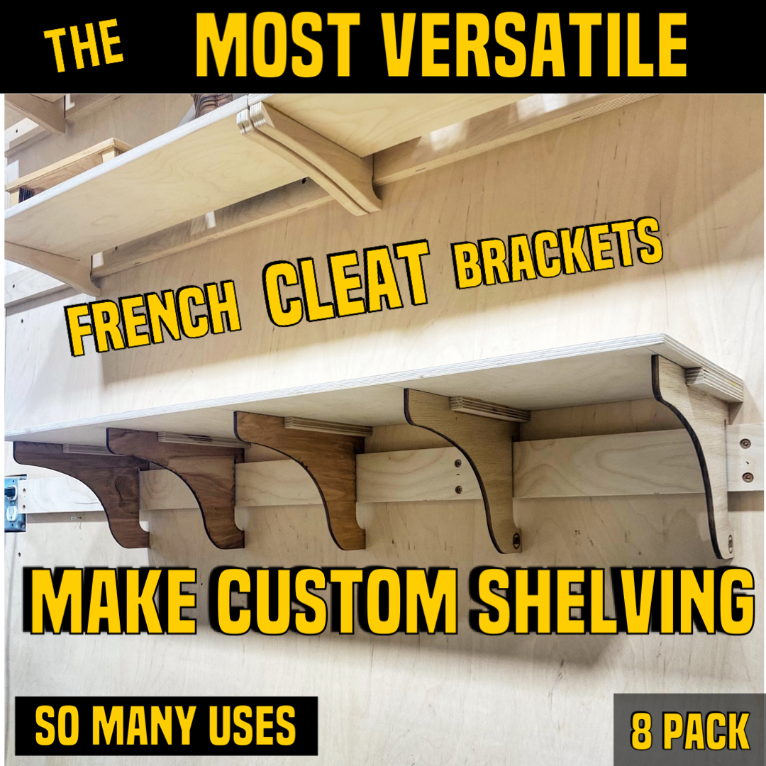 My most versatile French cleat bracket yet! These Thin FRENCH CLEAT Brackets are made from high-quality domestic 1/4-inch plywood. As seen in this video, they can be used individually for lightweight shelving, or they can be glued together for heavy-duty applications. Get creative and find uses for these all over your shop!