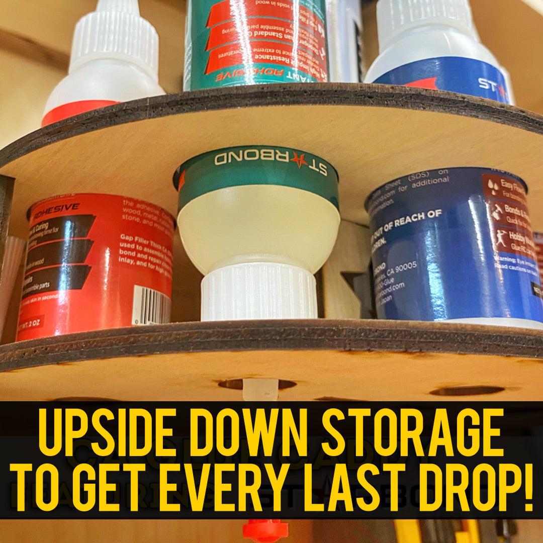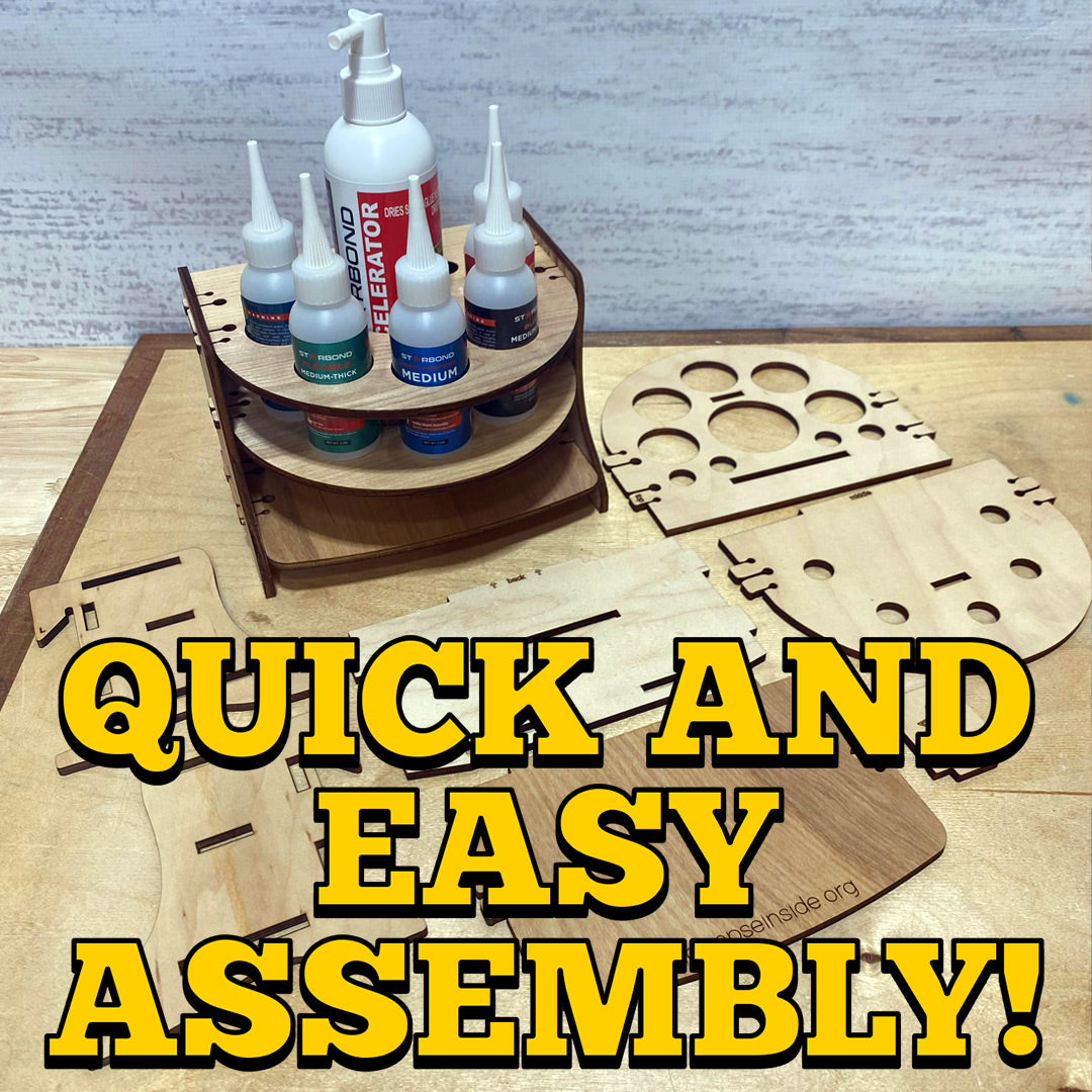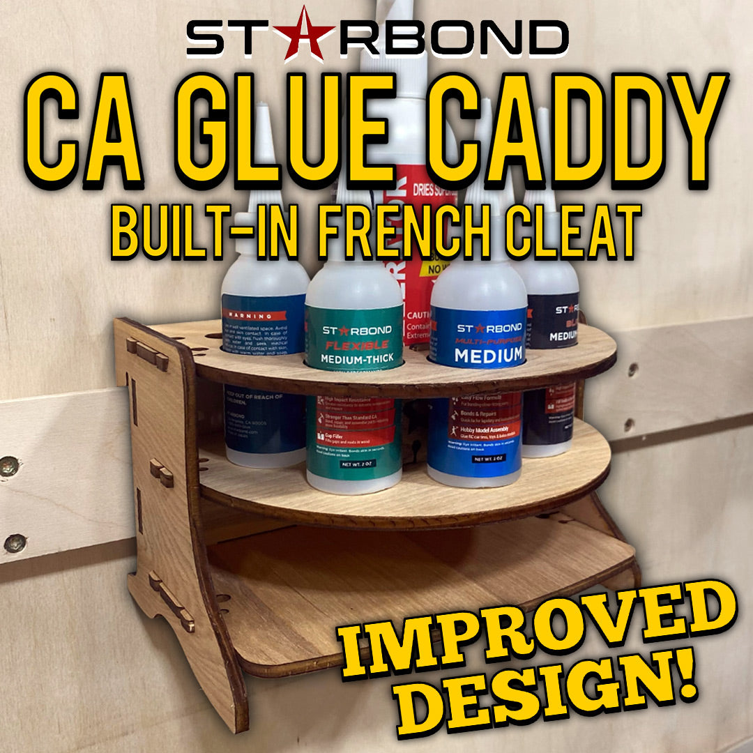 This easy-to-assemble CA glue caddy is designed to hold five 2-ounce bottles of Starbond CA Glue plus a 6-ounce bottle of Starbond activator spray. It even has storage for extra nozzles! It's designed to let you store the CA glue bottles upside-down so you can get every last drop out of there.