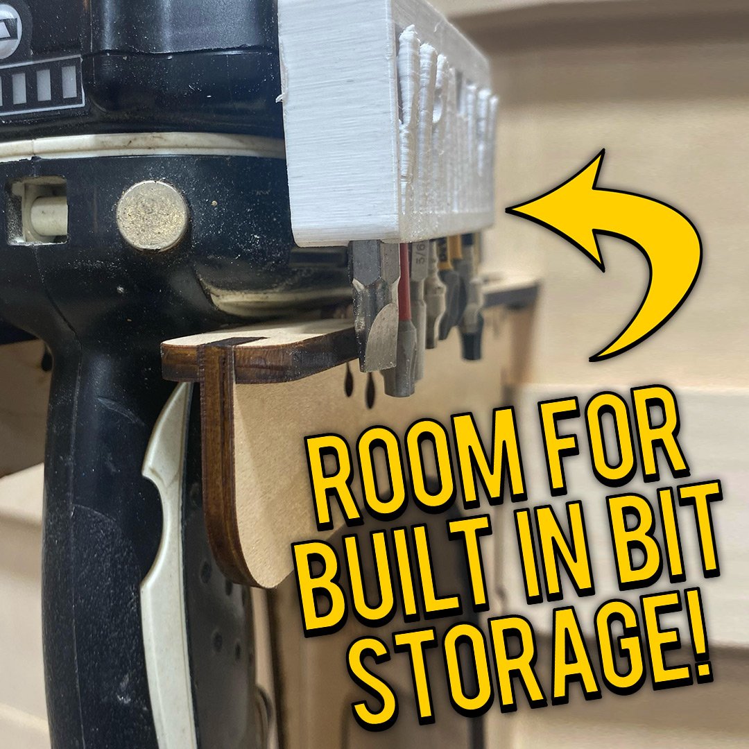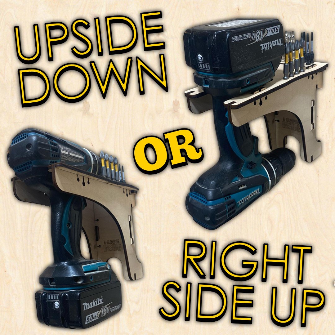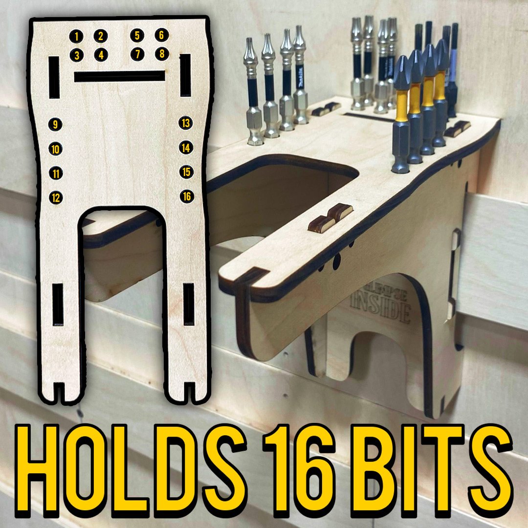 Whether you're a right-side-up or an upside-down kinda person, it'll cradle your drill or impact driver just fine. Not only that, it's also got room for 16 of your go-to drill or impact bits. And for those of you who have storage already built into your drills or drivers, don't worry! Our Laser Cut Drill Holder can handle that too, with all your bits still attached.